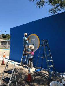 Mac Sales double sided mural for Cleveland Elementary School in Santa Barbara. It was a beaten down handball wall on their playground that he repaired and painted both sides with the school logo and mascot. It really made their playground light up.